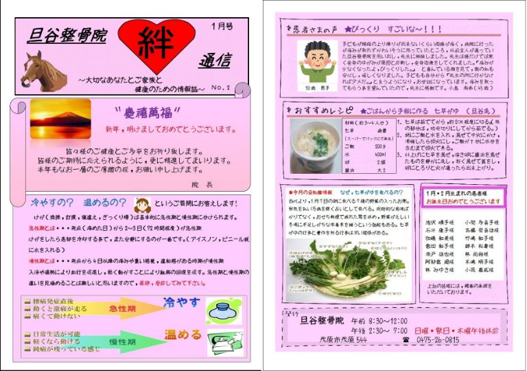 子どもが階段の上り降りが出来ないくらい両膝が痛く、病院に行ったが、痛みが取れずかわいそうに思っていたところ、以前主人が通っていた旦谷整骨院を思い出し、旦谷先生に相談しました。旦谷先生は膝だけでは無く全身の歪みが原因とし、全身の施術をしてくれました。「痛みが少なくなったよ、びっくりした。」と喜んでいました。子どもも自分から「先生の所に行かなければダメだ。」というようになり、お世話になっています。痛みを取ってもらう事を望んでいたので、旦谷先生に感謝です。